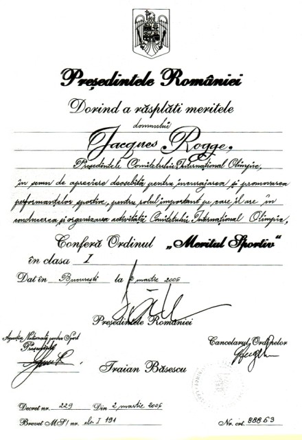 In cadrul aceleiasi intalniri, Octavian Morariu i-a inmanat lui Jacques Rogge ordinul Meritul Sportiv clasa I, acordat de presedintele Romaniei „in semn de apreciere deosebita pentru incurajarea si promovarea performantelor sportive si pentru rolul important pe care-l are in conducerea si organizarea activitatii CIO”.