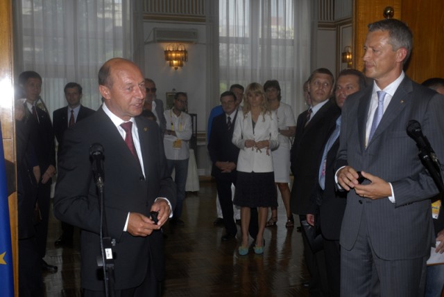 "Tinem pumnii cu totii sportivilor romani. Nu conteaza neaparat medaliile, conteaza locurile 1-6, care aduc glorie Romaniei, conteaza lupta. Nimic nu e mai inaltator decat un sportiv epuizat, dar fericit, invingator. Aici, suntem in competitie cu lumea. Sustinatorul cel mai important al vostru, al sportivilor, este poporul roman", a afirmat Traian Basescu, vizibil emotionat, aproape in lacrimi, dupa care a adaugat ca va pleca spre tara imediat dupa ceremonia de deschidere a JO 2008 si ca nu va mai putea asista, din cauza inundatiilor din tara, la meciul de handbal dintre Romania si Kazahstan si nici la meciurile Alinei Dumitru la judo.