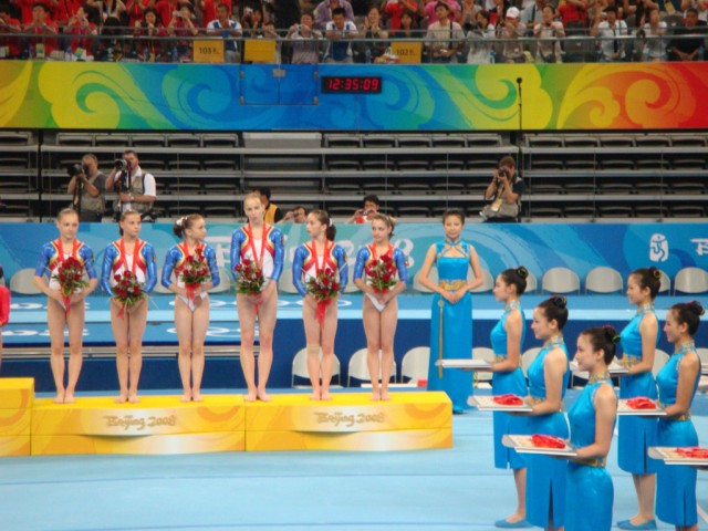 Batalia pentru aur s-a dat intre China si Statele Unite ale Americii, reprezentantele tarii gazda adjudecandu-si in final titlul olimpic, cu un total de 188,900 puncte, in timp ce americancele au intrat in posesia medaliilor de argint, cu un total de 186,525 puncte.