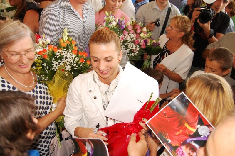 In ciuda faptului ca erau extrem de obositi dupa ce seara au participat la superba festivitate de inchidere a JO si au pornit la drum dimineata, dupa numai cateva ore de somn, pe aeroport medaliatii parea foarte proaspeti. Cu zambetul pe buze si extrem de fericiti, ei au impartit cu darnicie autografe si s-au fotografiat cu cei prezenti. De asemenea, desi au avut permisiunea sa plece spre casa cand doresc, toti olimpicii au acordat interviuri zecilor de reprezentanti ai mass-media, in ciuda faptului ca pe chipuri li se citea nerabdarea sa ajunga acasa in bratele celor dragi.