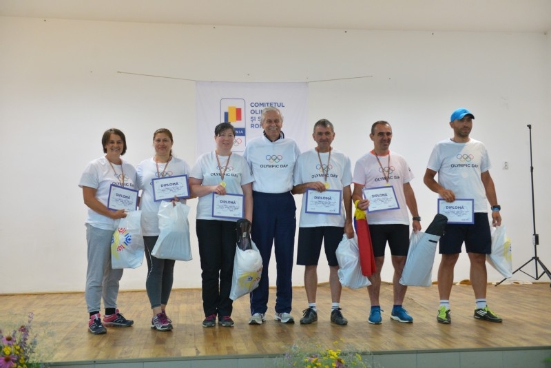 Simona Amanar, Marica Puica, si Paula Ivan, dubla medaliata la JO de la Seul din 1988 - aur la 1500 m si argint la 3000 m, Arthur Hoffmann, directorul onorific AOR, si Alexandra Nica, directorul departamentului Educatie Olimpica Sport Scolar si Universitar din cadrul COSR au inmant premiile castigatorilor Crosului „Ziua Olimpica” Sirnea 2018.