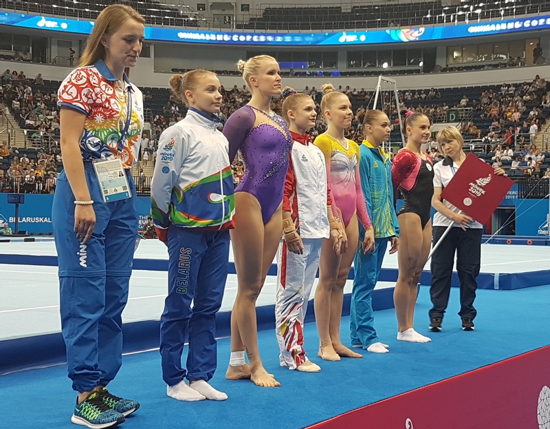 Inainte de ultima intrata in competitie Nina Derwael (Belgia), Denisa Golgota era pe podium, dar belgianca a reusit o prestatie excelenta pentru care a primit cel mai bun punctaj din concurs 13.766. Derwael a urcat astfel pe prima pozitie, devansandu-le pe marea favorita Angelina Melnikova, din Rusia (13.600) si pe Diana Varinska, din Ucraina, (13.100), care au incheiat pe locurile 2, respectiv 3, iar romanca a coborat pe 4.