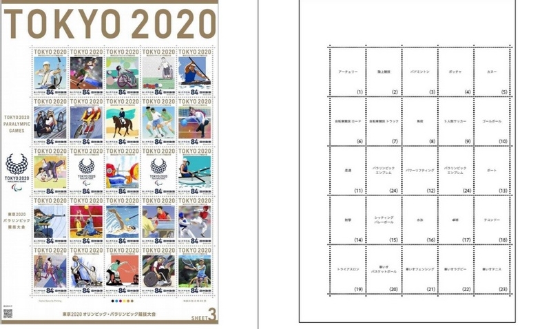 Timbrele vor ilustra cele 50 de competiții din cadrul Jocurilor Olimpice și 23 de întreceri paralimpice, o broșură de timbre Jocuri Olimpice și Paralimpice Tokyo 2020, care va costa 10.000 ¥ (65 GBP / 90 USD / 77 EUR), urmând a fi pusă în vânzare în aceeași zi.