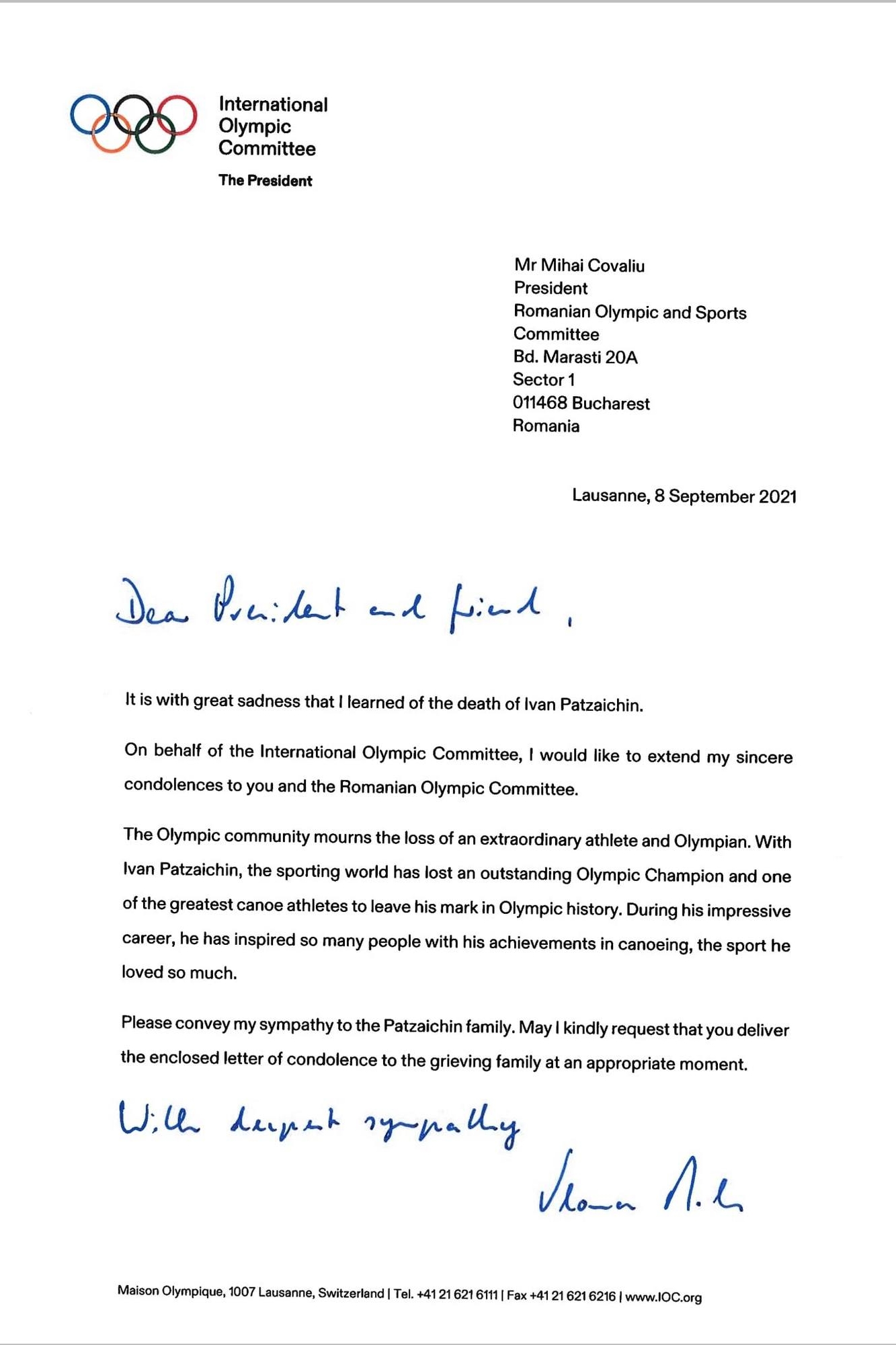 COSR, prin președintele Mihai Covaliu, a transmis familiei Patzaichin cealaltă scrisoare de condoleanțe trimisă de Thomas Bach.