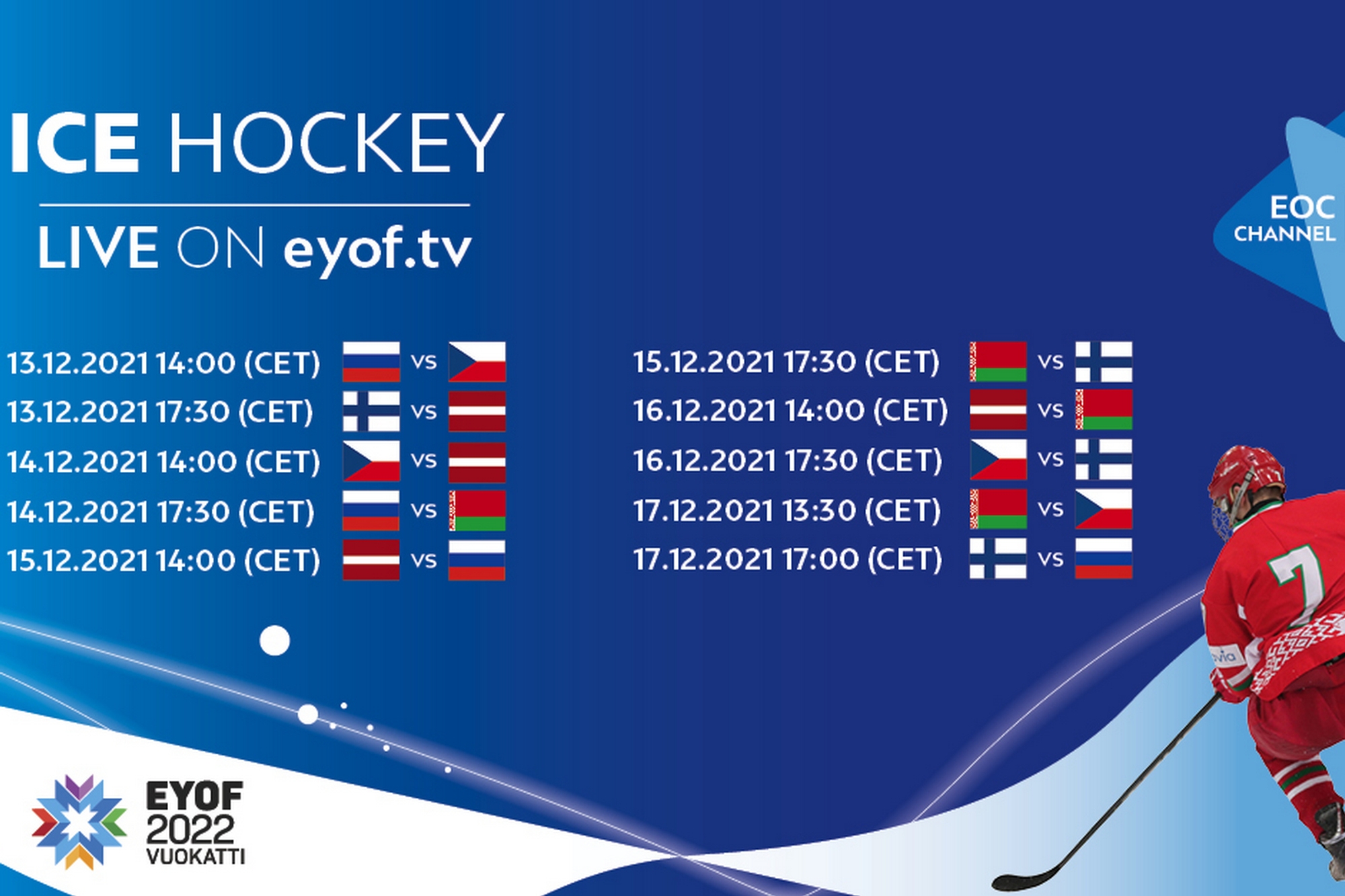 Reprezentativele Rusiei, Belarusului, Cehiei, Letoniei și Finlandei se vor întrece în turneul masculin de hochei pe gheață din cadrul Festivalului Olimpic al Tineretulu European FOTE Vuokatti 2022, care începe astăzi.