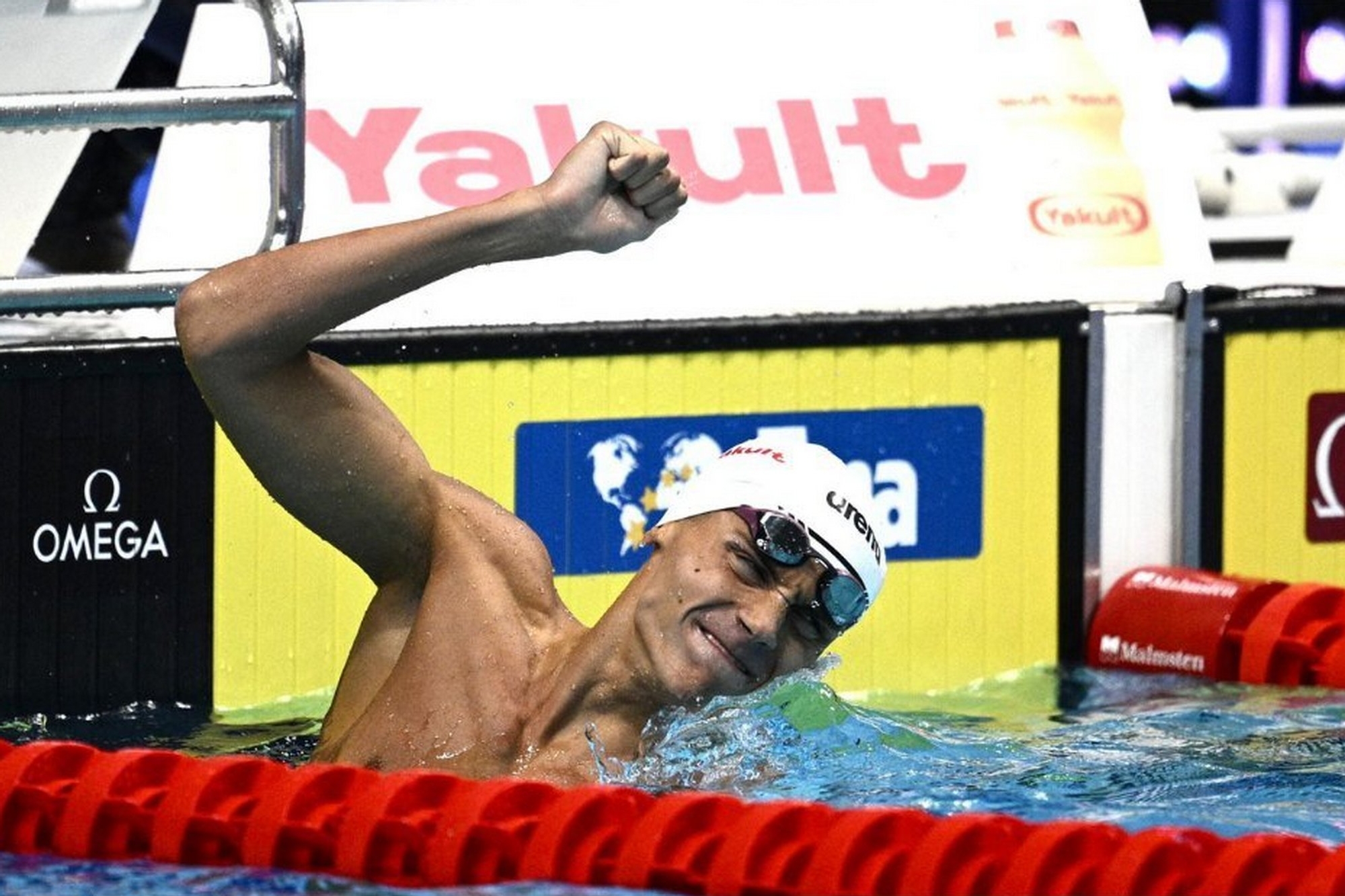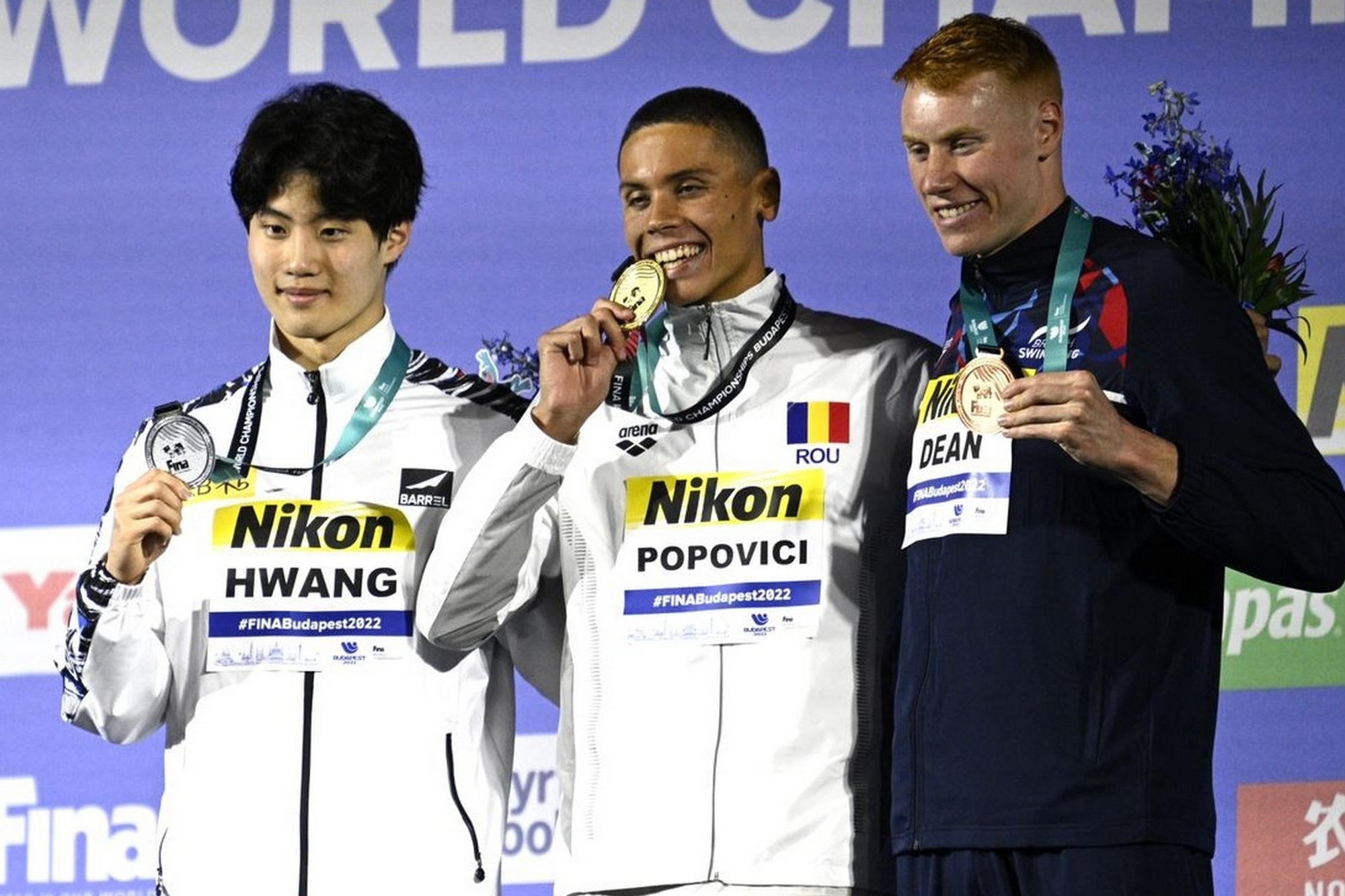 David Popovici este primul campion mondial de seniori al României într-o probă masculină de înot și a primit prețioasa medalie chiar din mâinile fenomenalului Ian Thorpe, de cinci ori campion olimpic la înot. Cameliei Potec, președintele Federației Române de Natație și Pentatlon Modern, i-a înmânat buchetul de flori.