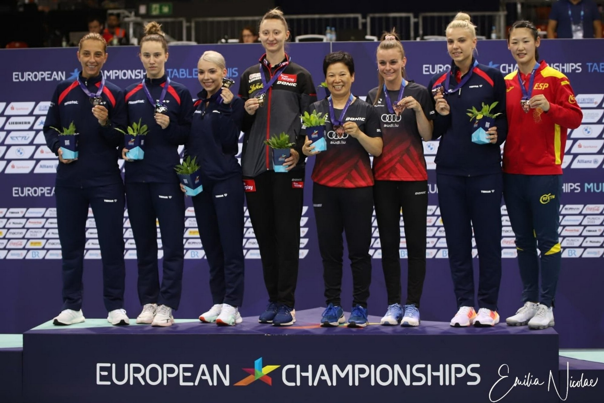 Seară magică pentru România la competiția de tenis de masă din cadrul Campionatelor Europene care se desfășoară la Munchen. Reprezentantele noastre au urcat pe toate cele trei trepte ale podiumului continental la finalul întrecerilor feminine de dublu.