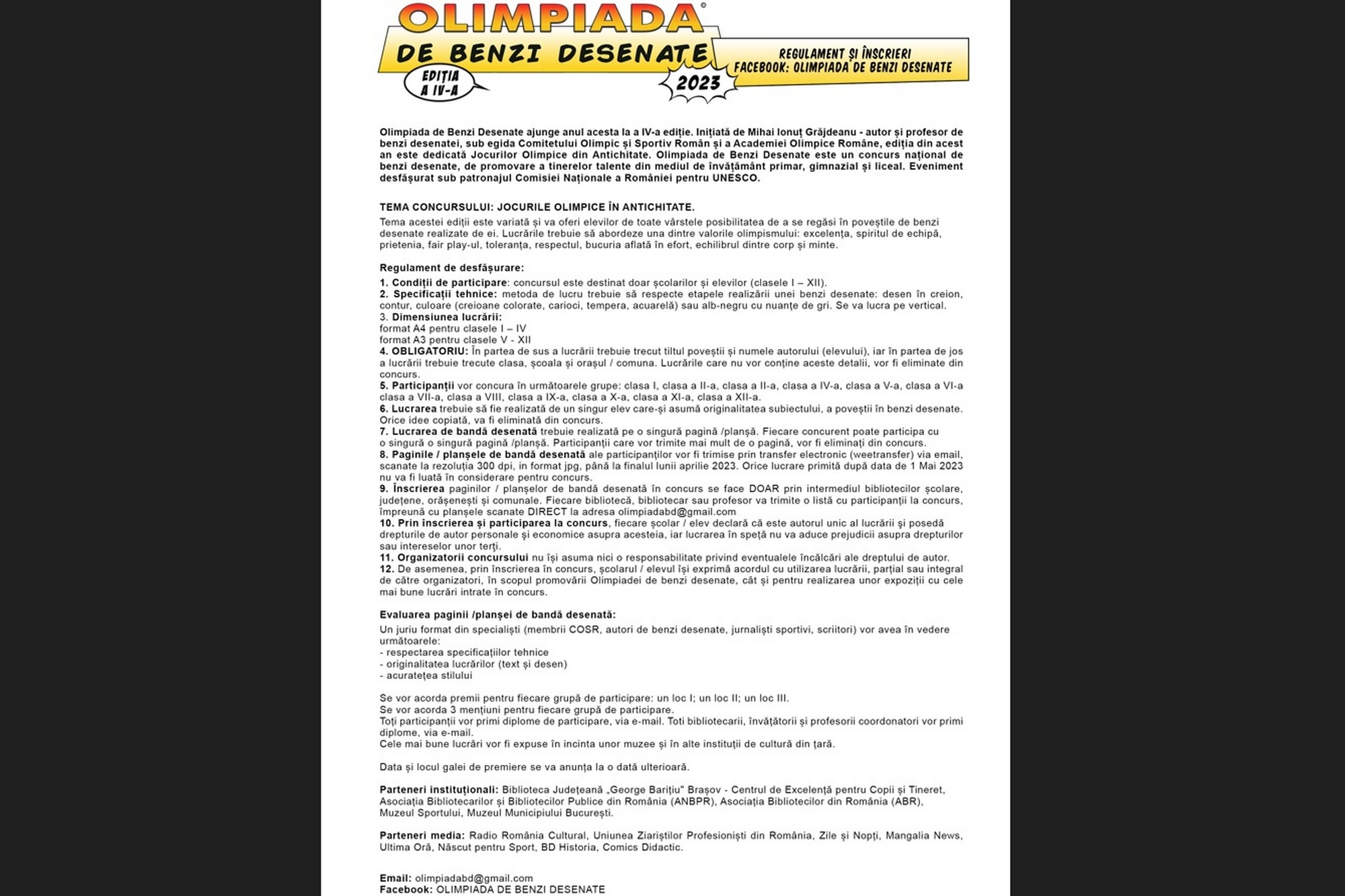 Competiția inițiată de Mihai Ionuț Grăjdeanu, profesor de benzi desenate, care se desfășoară sub egida Comitetului Olimpic și Sportiv Român și a Academiei Olimpice Române (AOR), își propune să promoveze tinerele talente din învățământul primar și liceal.