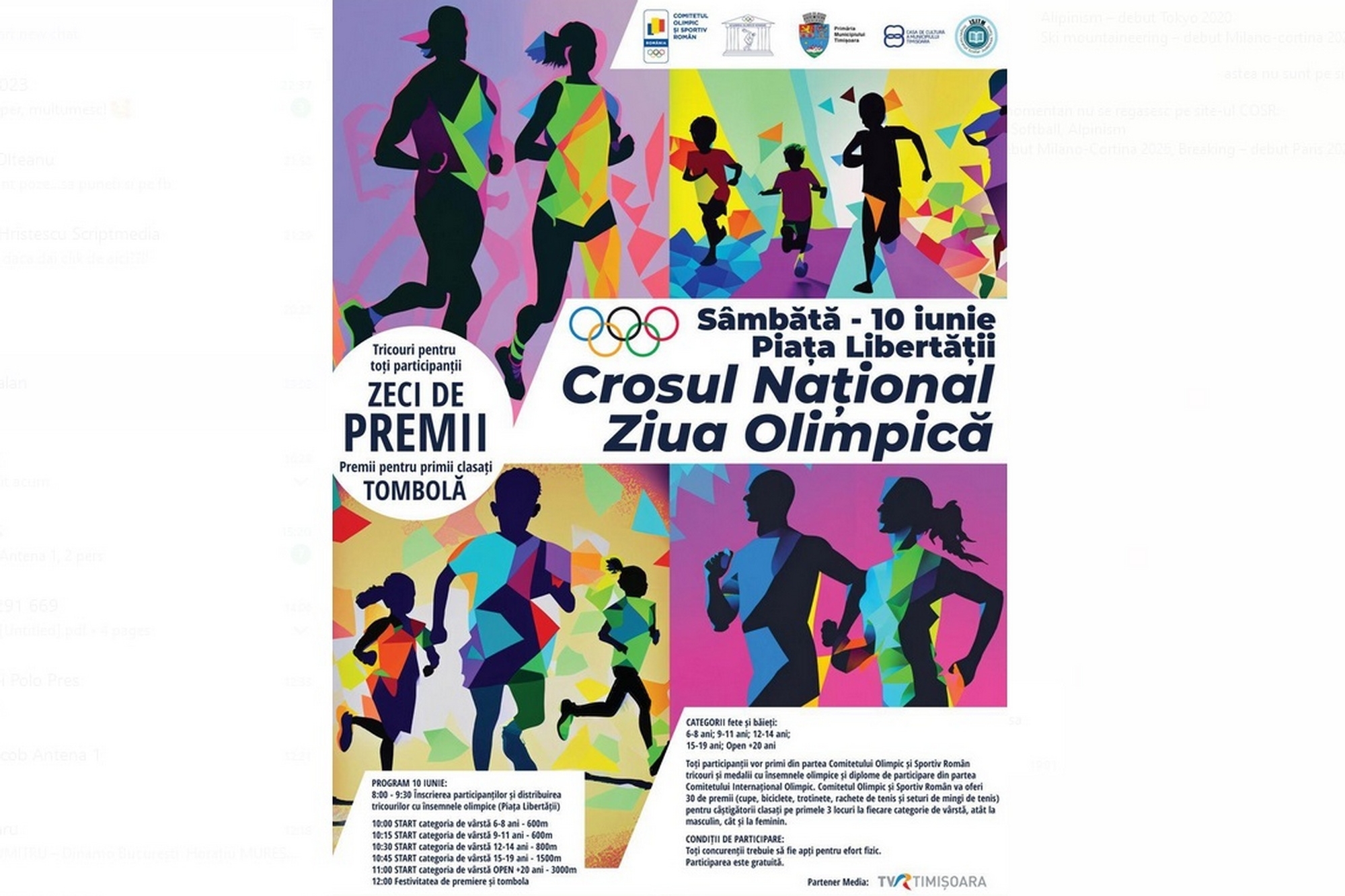 Iubitorii de mișcare se vor putea înscrie GRATUIT la competiția tradițională susținută de Comitetul Olimpic și Sportiv Român (COSR), prin Academia Olimpică Română (AOR), cu sprijinul Primariei Municipiului Timișoara și al Inspectoratului Școlar Județean Timș, atât în Piața Libertății din Timișoara între orele 8:00 și 9:30 cât și accesând link-ul https://forms.gle/WLrXRu8z9b2gdNR19