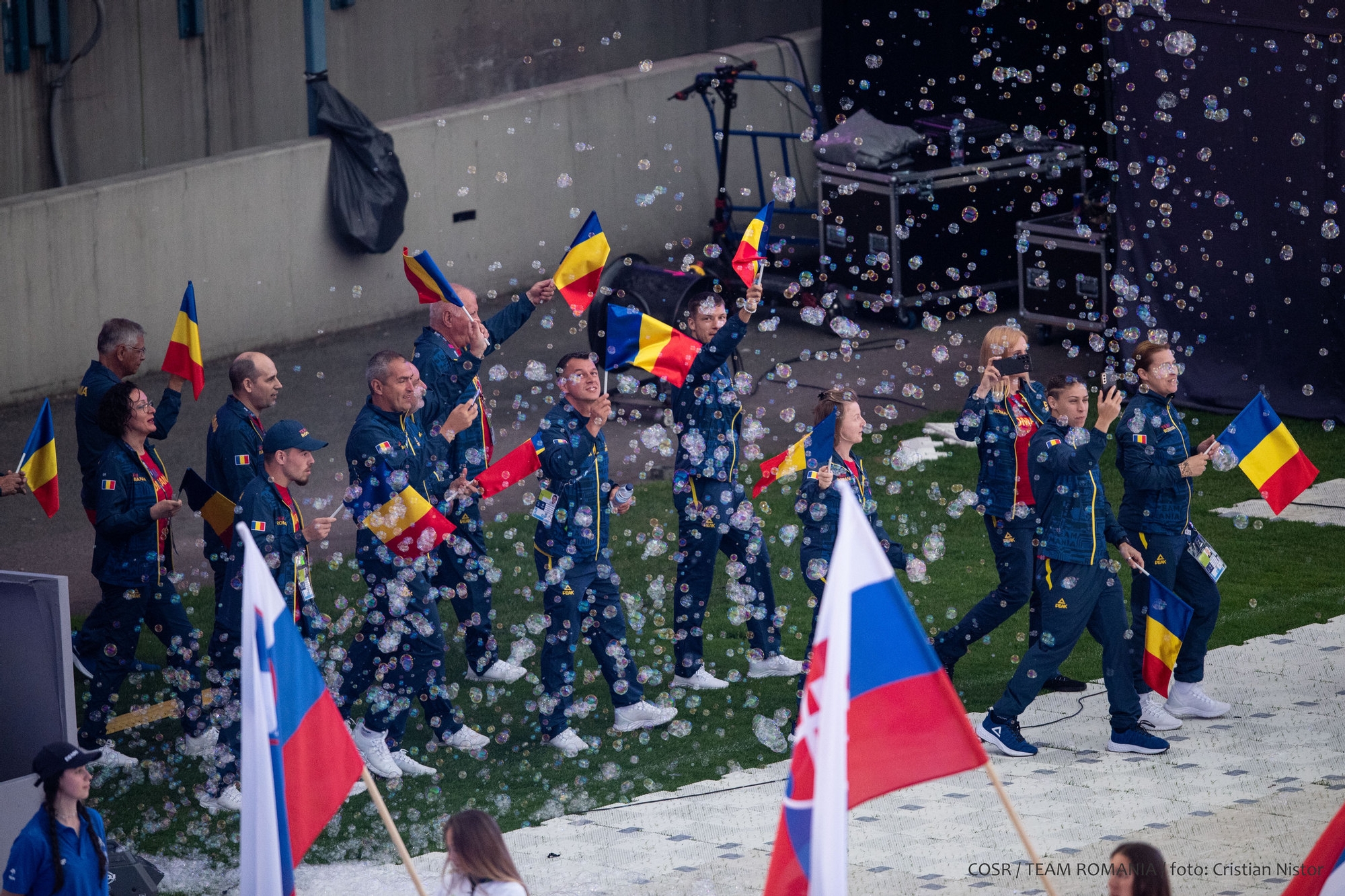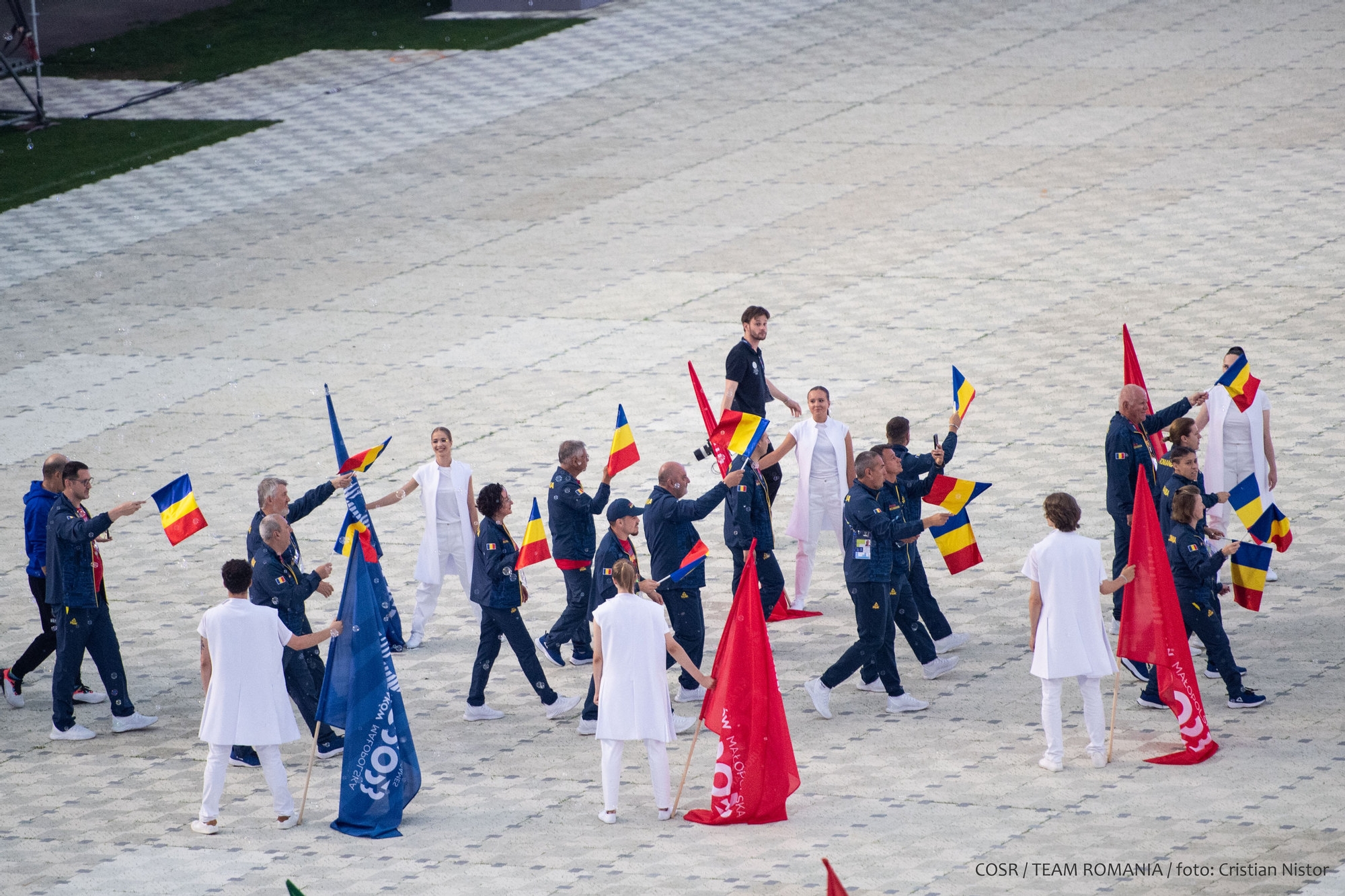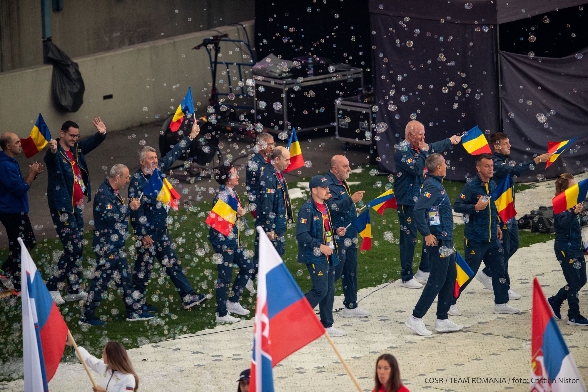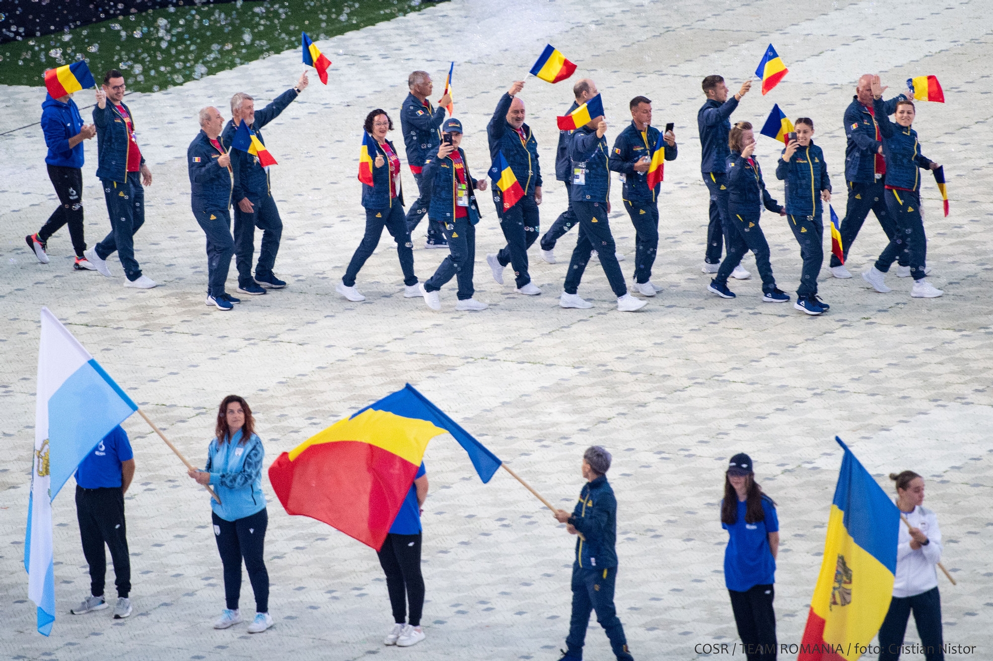 Mica delegație care a reprezentat ROMÂNIA la festivitate a fluturat stegulețele tricolore și a salutat publicul care timp de 12 zile a susținut și a aplaudat din tribune performanțele sportive.