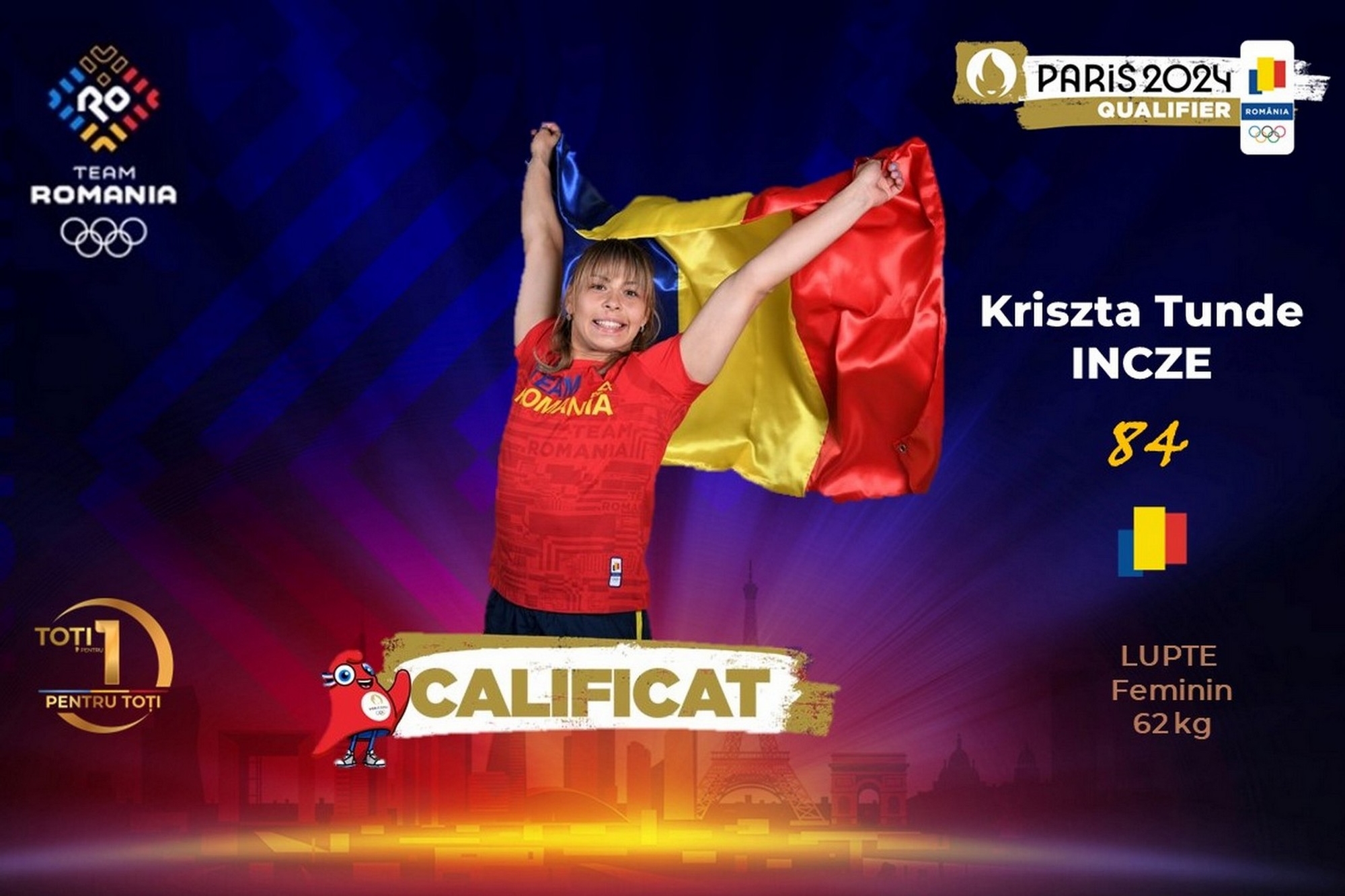 La Turneul Preolimpic Mondial de lupte din Turcia, de la Istanbul, ultima competiție de calificare la Paris 2024, Kriszta Incze a devenit cea de-a 84-a componentă a TEAM ROMANIA pentru Jocurile Olimpice de la Paris.