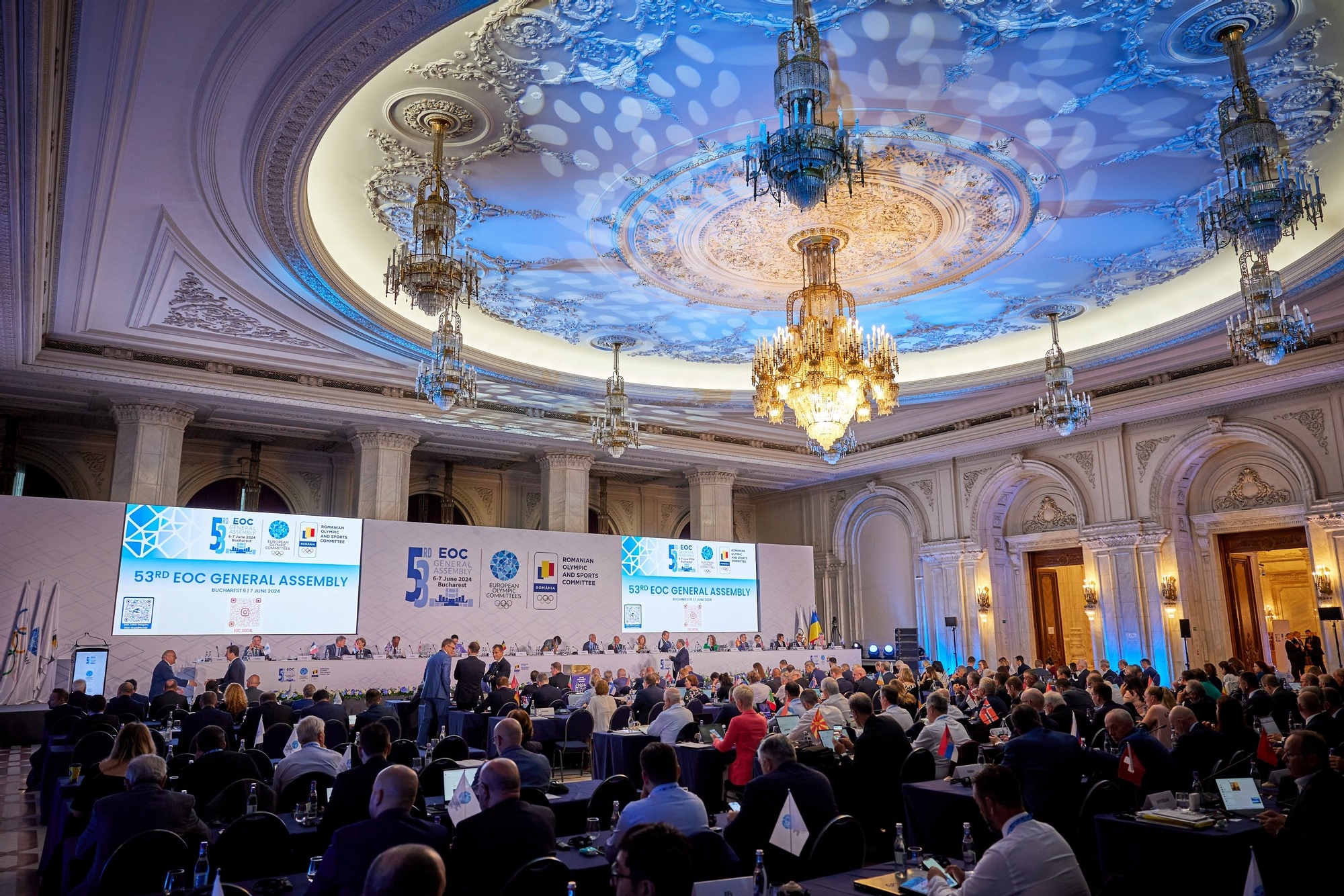Spiritul Olimpic a pătruns astăzi în fiecare colț din impozanta Sală IC Brătianu din incinta Palatului Parlamentului, din București. Liderii Mișcării Olimpice Europene s-au reunit pentru prima zi a celei de-a 53-a sesiuni a Adunării Generale a Asociației Comitetelor Olimpice Europene (EOC), prezidată de membrii Comitetului Executiv al EOC și Thomas Bach, președintele Comitetului Internațional Olimpic, oaspetele de onoare al Adunării.
